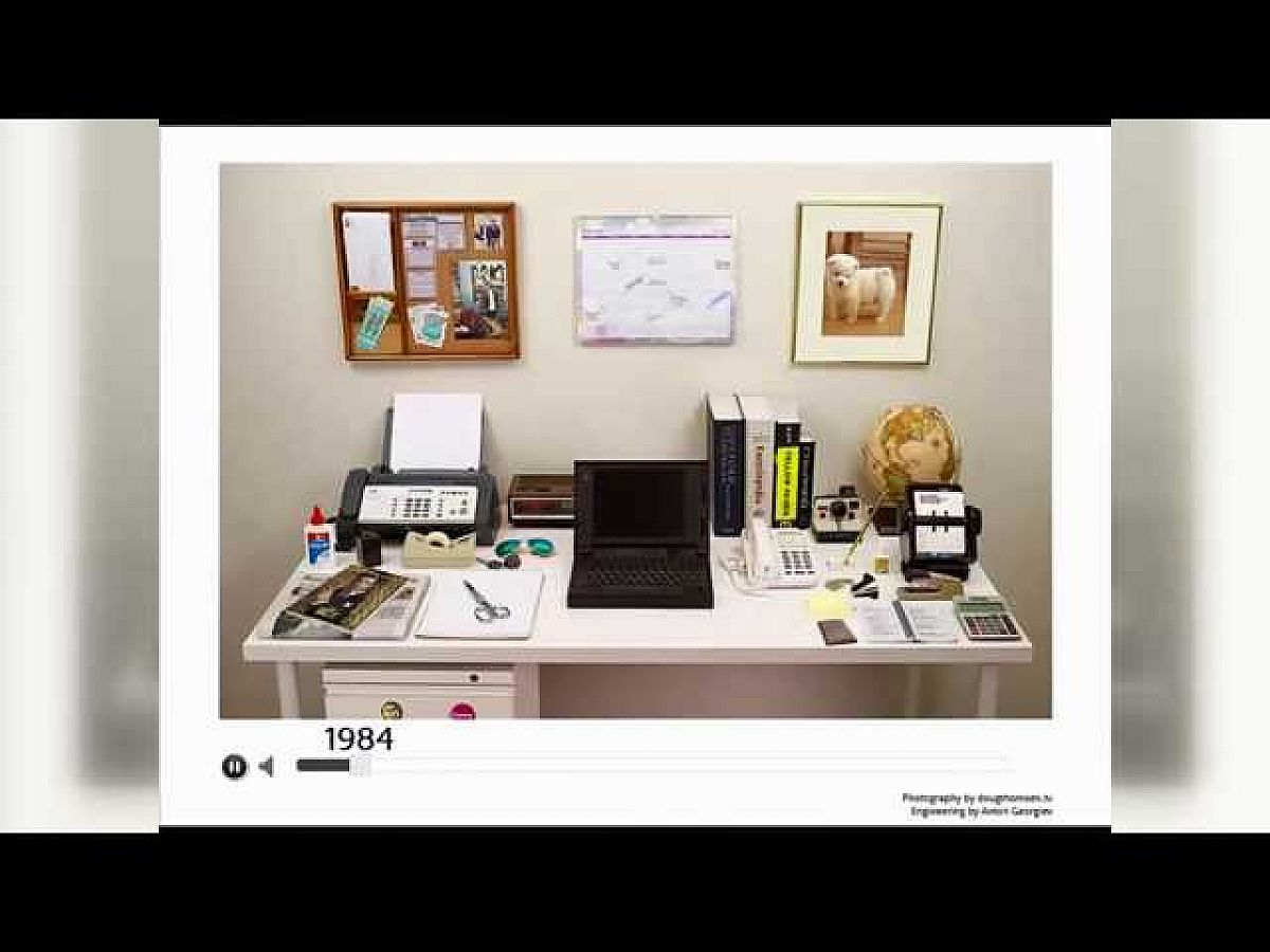 Ez a rendkívül kreatív módon összeállított - egyébként eredeti formájában interaktív - animáció személetesen mutatja be azt, hogy miként is alakult át a tipikus felhasználó irodai, illetve munkaasztala a '80-as évek elejétől napjainking.