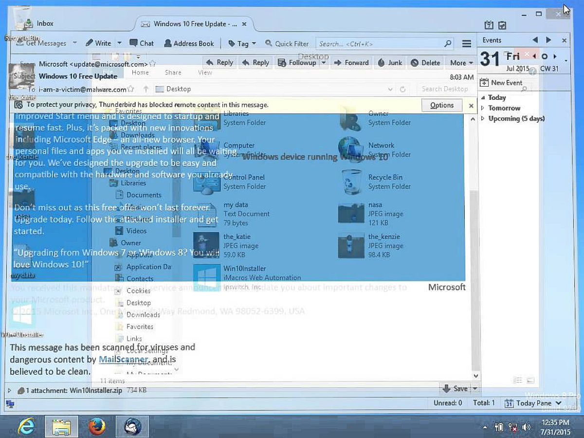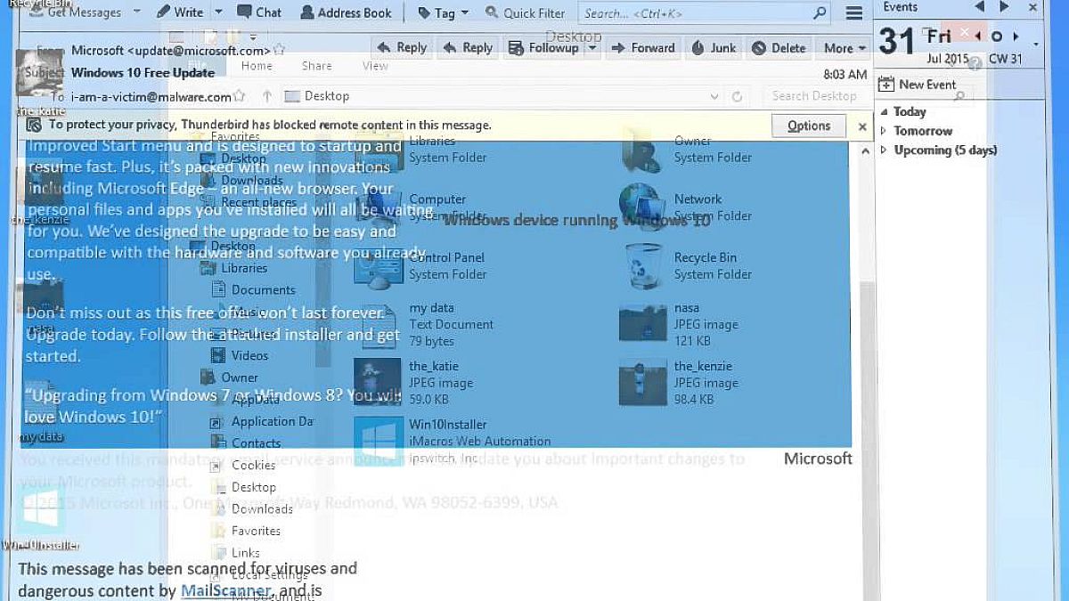 Vagy legalábbis semmiképpen se dőljön be egy emailben terjedő ajánlatnak, ami az új rendszerre történő frissítést ígér - valójában azonban egy vírust rak a gépre.