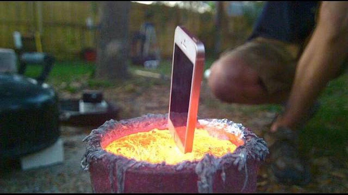 Szerencsétlen mobilt ugyanis egy vödörnyi olvadt alumíniumba mártják, amire az meglepő módon reagál. Egyrészt ugyanis nem robban fel a merítéskor, másrészt nem sokkal az elsüllyedés után felszínre kerül, méghozzá látszólag szerény károsodással, csak némi plusz alumínium-bevonattal ellátva.
