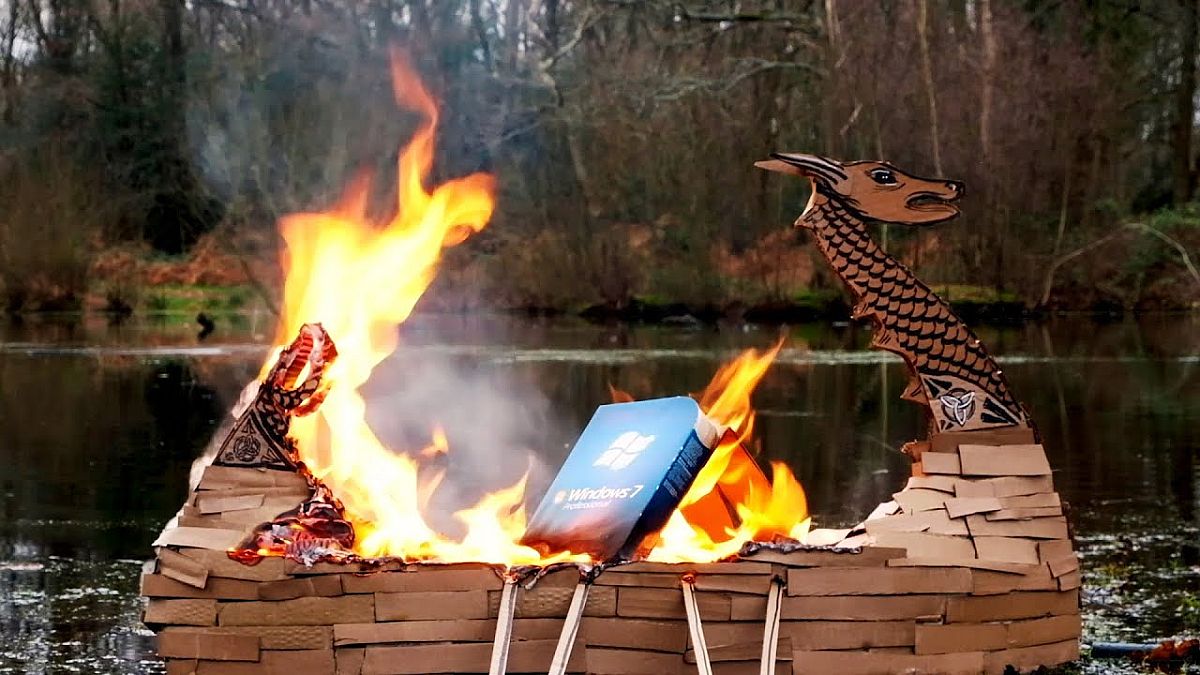 Ennek során a Windows 7 egy kópiáját egy a fa hajócskára rakták, amit felgyújtottak, hogy így térhessen az örök nyugalomra a tengeren elporladva. A stílusos temetésben nyilván egy kis móka is volt, ugyanakkor a cég szerint arra is fel akarták hívni a figyelmet, hogy tényleg ideje végső búcsút vennie mindenkinek a rendszertől, és áttérnie annak egy biztonságosabb utódjára.